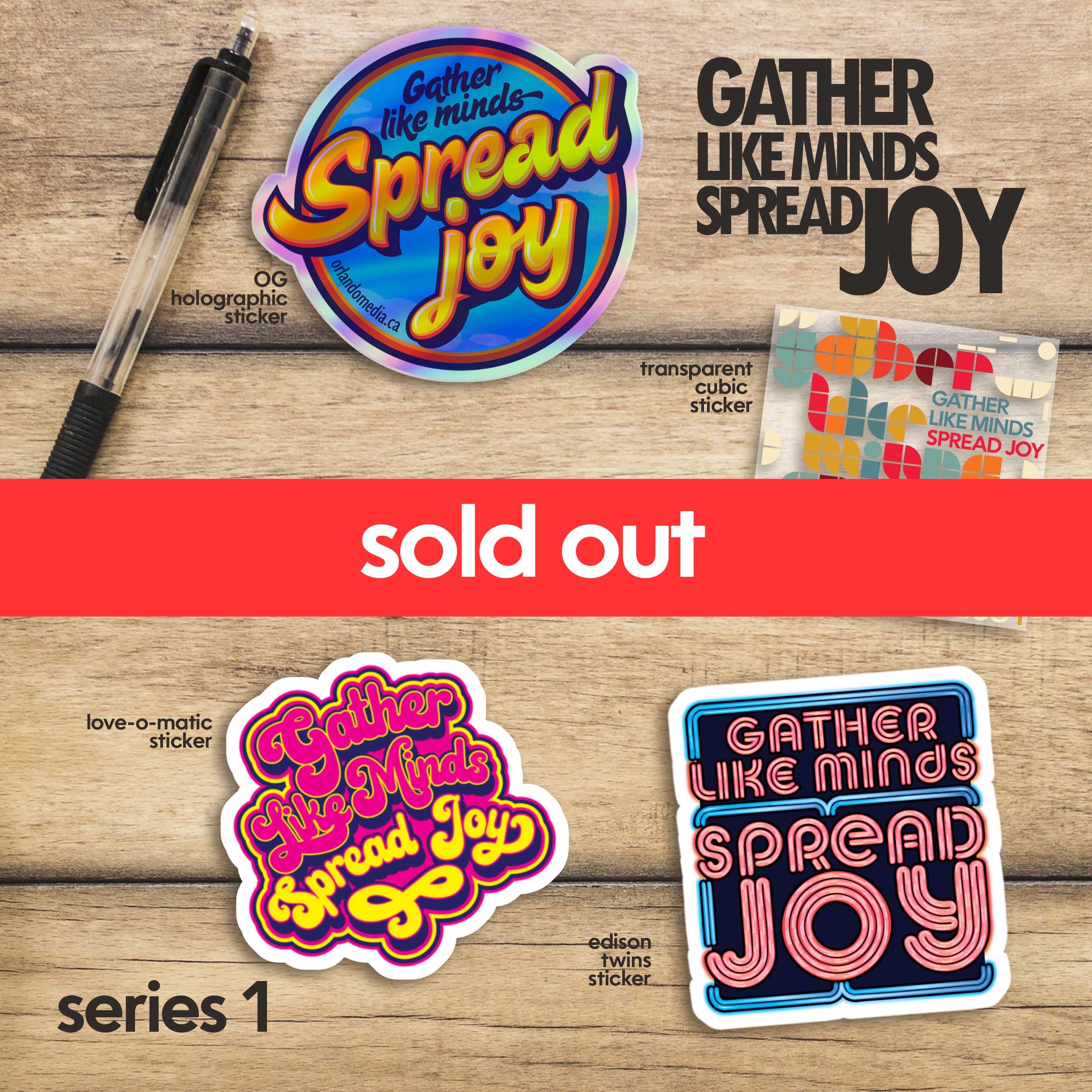 Gather Like Minds Spread Joy – Complete Series 1 Bundle. Includes all four stickers, Transparent Cubic, Love-o-matic, Edison twins and the OG Spread Joy variants!