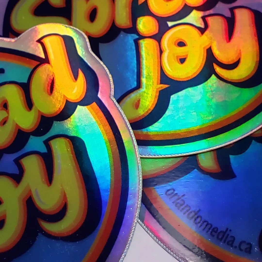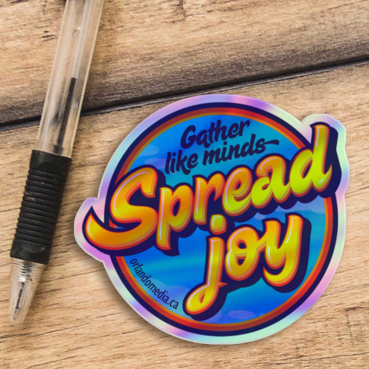 The original, ‘Gather Like Minds, Spread Joy’ holographic sticker.
