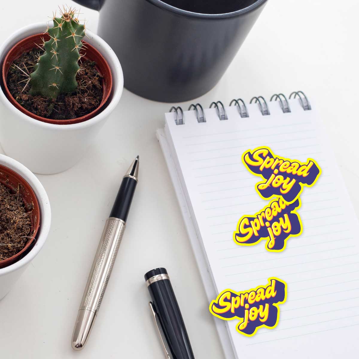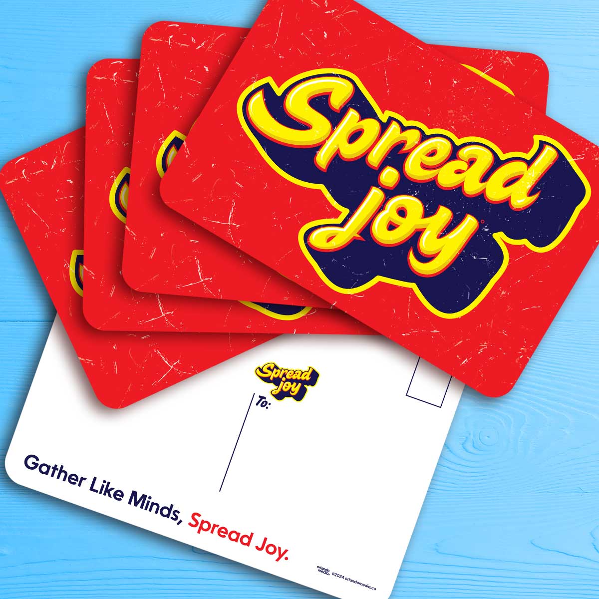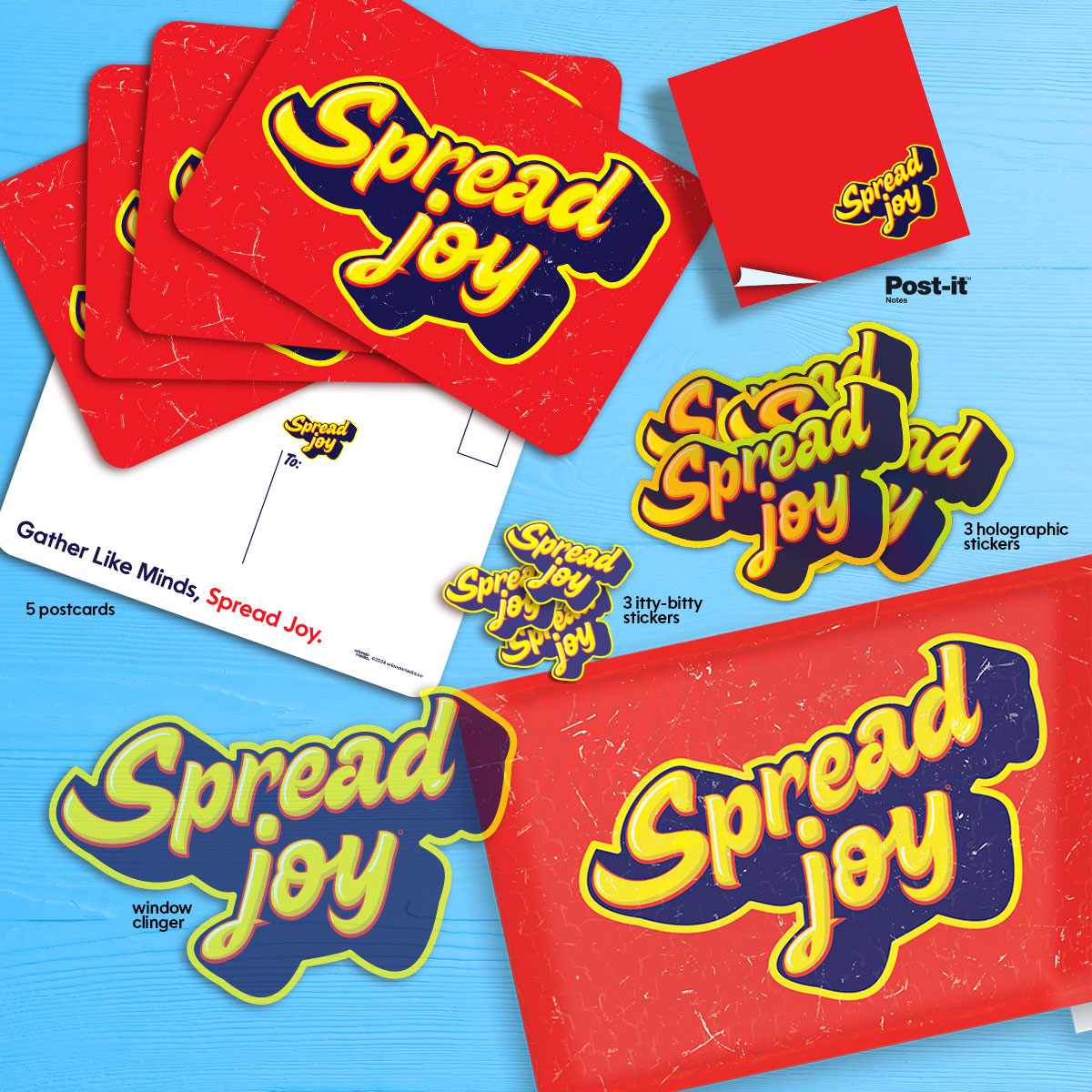 The Ultimate Spread Joy Ambassador kit. Stick a spread joy clinger in your car window, or in your office. Leave a post-it for someone you care about. Drop a sticker in your corner of your world to remind folks to spread a little joy. Send your honey a postcard, let someone know you appreciate them. Just spread joy where you can!