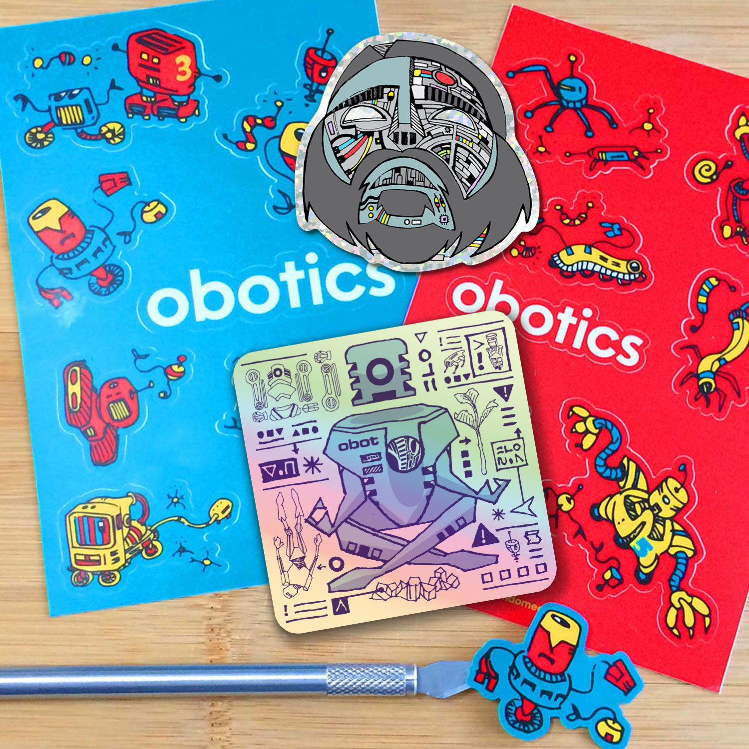 The Ultimate obotics robots multiple sticker bundle. Includes dual blue and red obotics sticker-sheets, ‘Element’ and ‘Brainiac’ stickers. SO MANY OBOTS !